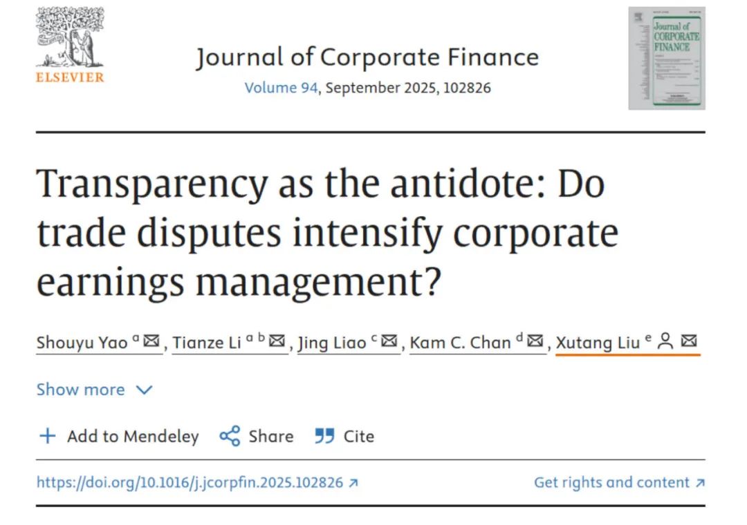 近日,我校kaiyun云开登录入口青年教师刘旭堂在金融学国际权威期刊Journal of Corporate Finance上发表题为“Transparency as the antidote: Do trade disputes intensify corporate earnings management?”的研究成果。刘旭堂为唯一通讯作者,kaiyun云开登录入口为唯一通讯作者单位。