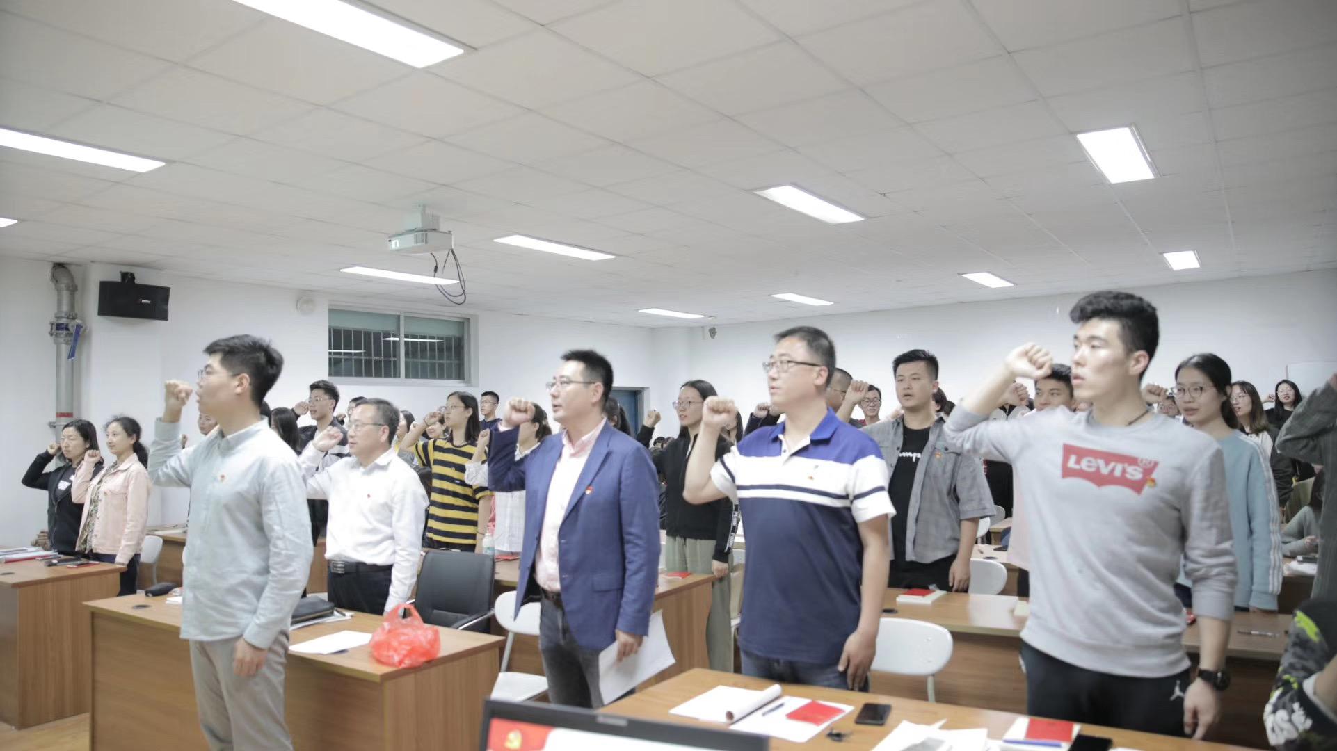 活动分两个阶段进行。第一阶段,组织新老党员集体宣誓及新党员佩戴党徽仪式。学生第一党支部书记周小昀、第二党支部书记李冉、第三党支部书记任龙分别为共22名新党员颁发党章、佩戴党徽,强化党员身份的认同感和归属感,提醒其时时处处不忘发挥党员的先锋模范作用。随后,所有与会人员面对党旗宣誓,在振振有声的宣誓中,新党员们满怀热情,许下了肩负重任、砥砺前行的承诺;老党员们回顾初心,更加坚定了作为一名党员的忠诚信仰,铭记自己的党员身份,牢记党员的责任和使命。2017级经贸5班马仁哲同学代表新党员表态,要把入党誓词终生铭记、身体力行,以全心全意为人民服务为原则,承担起作为大学生党员的光荣责任,对得起自己的青春与荣誉,不辜负组织的信任,以实际行动落实忠诚信仰。