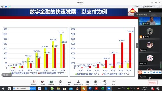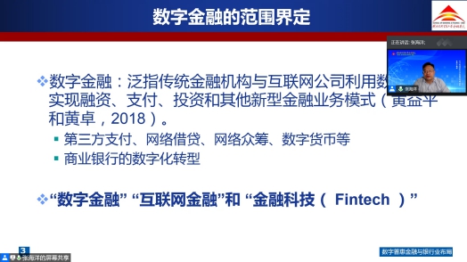 9月3日晚,对外经济贸易大学金融学院副院长张海洋教授为kaiyun云开登录入口师生近200人,在线上做了题为“数字普惠金融与银行业布局”的高端讲座。